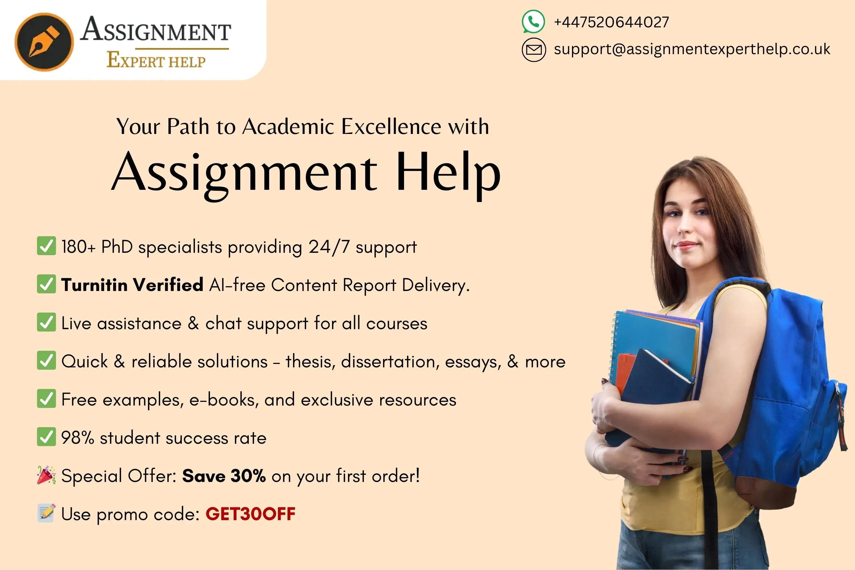 Your academic success starts here! Our team of assignment expert writers is ready to assist you in overcoming academic obstacles and relieving your workload. With 180+ PhD specialists offering the best 24/7 support, customised solutions, a plethora of free examples, e-books, and exclusive resources to help you polish your projects, our online assignment help service provides excellent assistance to students. You can save 30% on your first order when you use our promo code "GET30OFF”.